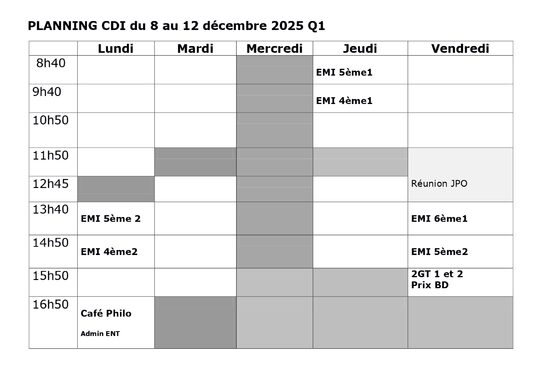 Page d'accueil du Centre de Documentation et d'Information, permet de consulter le planning hebdomadaire du CDI et d'accéder à différents services.